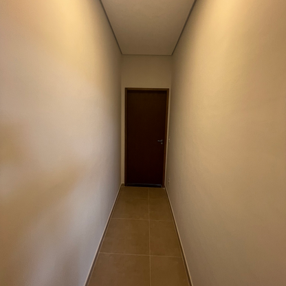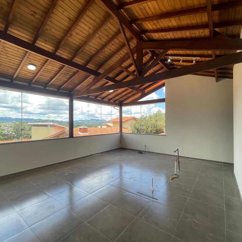 O pavimento térreo conta com garagem e quarto de depósito. O piso superior conta com quartos, sala, cozinha e varanda.